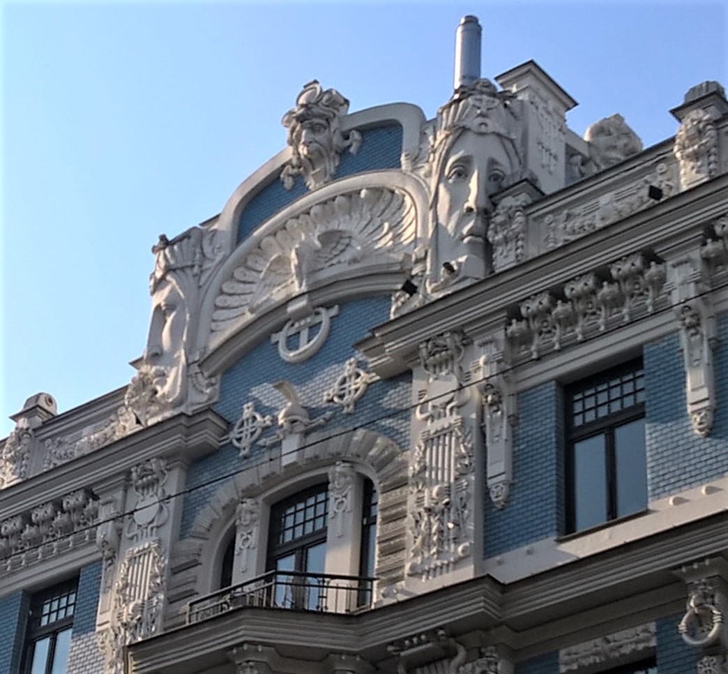 "Elizabetes iela" (in tedesco Elisabethstraße) fiancheggia invece in parte un vasto parco ed è la via in cui si trova, al numero 10b, il più celebre palazzo Art Nouveau di tutta Riga. Costruito nel 1903 sempre su disegno di Ejzenštejn, raggruppa tutte le caratteristiche del particolare Jugendstil eclettico righese, a cominciare dall'accostamento di colori azzurro-bianco, dalle figure mitologiche (mascheroni con teste di Medusa) e dalla profusione di aquile, ghirlande ed elmi. Foto di Jean-Pierre